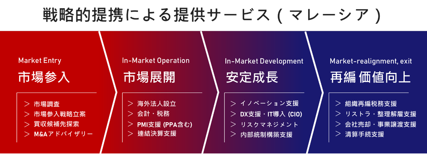 本提携により、世界27か国で海外展開支援実績を有するGGAの戦略・M&A・経営コンサルティング力と、アジアパシフィックに強固な基盤を持つNAC国際会計グループの会計・税務・人事領域の専門性を融合し、今後、成長が見込まれるマレーシア市場において、日本企業が直面する市場参入・事業運営・再編・撤退に至るまでの全フェーズを、一気通貫で支援する体制を構築いたします。